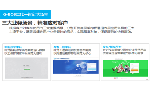 产品升级到第Ⅲ代,G-BOS在精细化方面堪称惊艳。它已经可以根据客车使用的三大不同场景提供三类平台,从此以后,新能源、两客一危、校车及班车三类细分市场上的用户都可选择自己的专属平台,这样做的好处是满足了不同用户业务管控的需求,实现精准对接,以此保证服务的快捷高效。