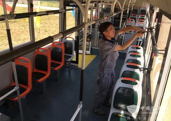 2017年6月10日,工作人员在做电动客车下线试乘前的准备。