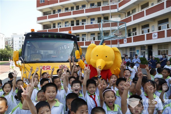 “看,有大象!”活动一开始,金旅校车卡通形象“小金象”就吸引了所有孩子们的目光。可爱的小金象扭扭鼻子,挥舞挥手,憨态可掬,刚出场就被孩子们团团包围!在小金象的带领下,十名学生代表一起参观金旅校车,工作人员为孩子们介绍金旅校车与一般客车的区别,并为孩子们讲解安全乘车的知识。只听一遍,孩子们就记下了校车安全乘坐小知识,还上台与其他同学做了分享呢。
