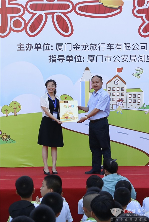 活动的最后是捐赠环节,金旅客车国内销售总监赖志艺上台,将安全手册赠送给华悦学校。《小金象儿童安全手册》是厦门金旅特别制作的,通过漫画的形式,让小朋友们在生动有趣的阅读中,学习在生活细节中增强安全意识, 加强面对各种危险时的应急能力。