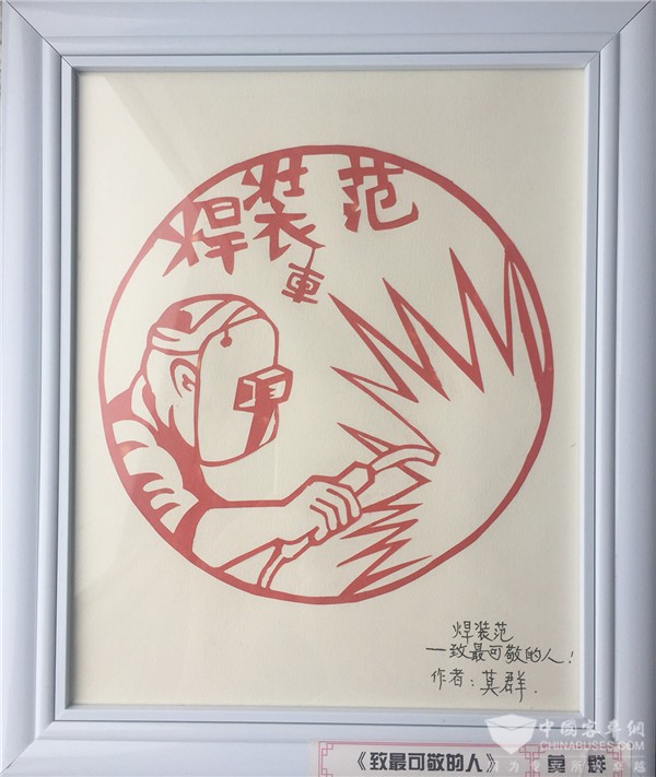 在吴和平的办公桌上,摆放着一幅剪纸作品。醒目的“焊装范儿”四个字下面还剪出一个“車”的LOGO,工人焊接的场景也被巧妙地剪裁出来。吴和平拿着裱好的作品指着下面的一行字,提高了声音说,“这(作品)叫‘致最可敬的人’”