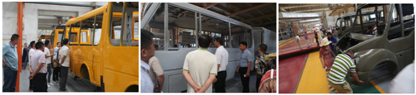 各位客户拿出了“淘金”的态度,细致地考察了校车从车身焊装、电泳、涂装到总装、性能测试等生产流程。在参观电泳作业环节,他们表现出更浓厚的兴趣,仔细询问、对比电泳前后车身光洁度的变化,以及对后续使用的好处。
