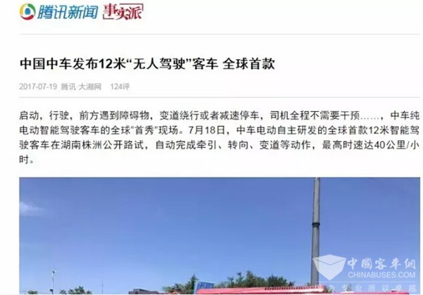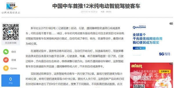 “中国中车发布12米纯电动智能驾驶”