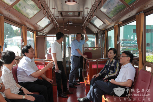 坐在参观的仿古铛铛车上,魏银仓董事长向郑厅长介绍了银隆纯电动客车的情况。近年来在北京、邯郸、西安、珠海等全国40多个城市取得良好的运营业绩,同时在2014APEC亚太峰会、2016第二届中美低碳峰会等多项国际活动上表现出绝佳的性能。