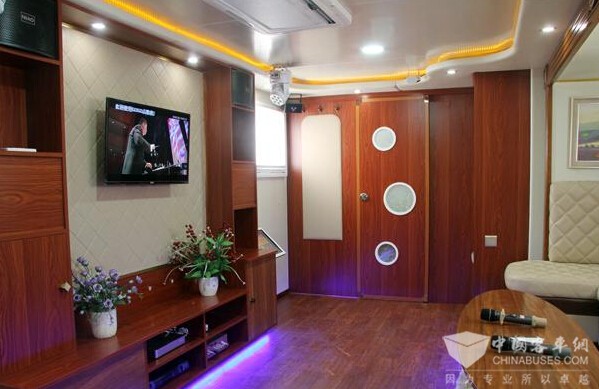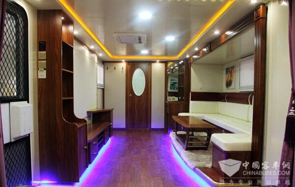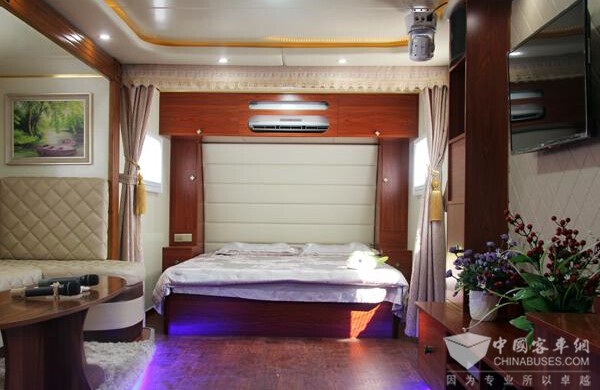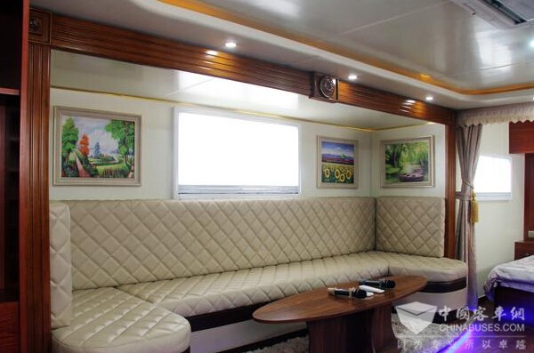 内饰家具采用防腐地板、耐磨地板革、生态环保板材打造,内置双人床、床头柜、高档 U 型皮革沙发(可转变成床)、高档酒柜、高档影视墙、电视柜、32寸液晶电视、皮革吊顶。另外,厨房区配备的是一款 50L 冰箱。卫生间为干湿分离式设计,卫生间配备了排风扇、豪华洗手盆/冷暖双水水龙头、化妆镜、电热水器、高档石英石台面洗手池、化妆镜、豪华淋浴间等设备等生活用具。具体车型,可根据客户需求进行选装。