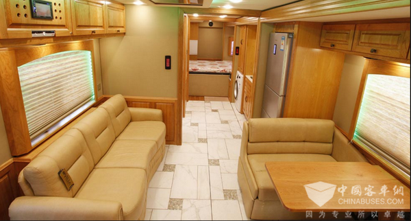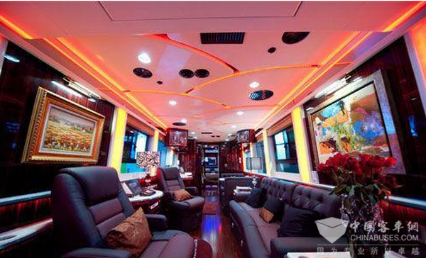 金龙礼宾车SCANIA系列RV6127豪华房车,外观使用德国进口漆喷绘,美观大方,富有艺术性。整体内饰采用名贵黑檀木,加上进口皮革,尽显奢华尊贵,地面采用木地板和局部瓷砖搭配融合,并配可拆卸式地毯,方便清洗。各区域均有电动推拉门,方便又具私密性。内部灯光可以调节搭配,客厅有40寸隐藏式电动翻转电视和五星级家庭影院音响系统。在寝室有一个为孩子准备的上下单人床,均有影音系统,配有蓝牙耳机。