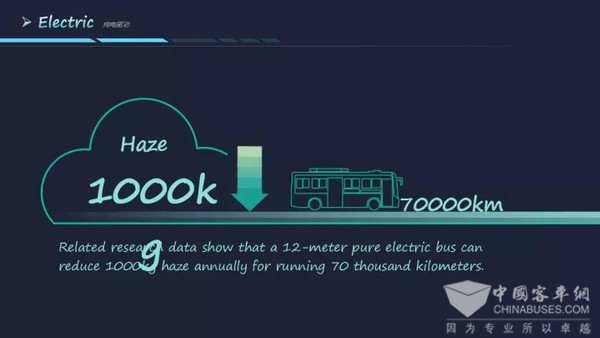 据相关研究数据表明,1辆12米纯电动公交年运行7万公里,每年能够减少1000kg的雾霾量。