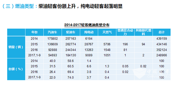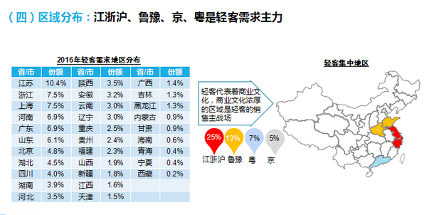 市场越是不好,竞争越是激烈。近些年,轻客企业市场表现明显出现分化,可谓“几家欢喜几家愁”。其中,江铃股份有限公司、北汽福田汽车股份有限公司近两年销量呈现持续增长态势。江铃股份有限公司则成了近两年轻客市场的最大“欢喜者”,2015年轻客的销量为63141辆,2016年的销量为70072辆,同比增长19.9%,2017年1-9月份的销量为54056辆,同比增长24.8%。此外,在产品格局方面,以江铃全顺、依维柯、上汽大通V80、江淮星锐、东风御风、奔驰凌特和福田图雅诺等欧系轻客产品的占有率在继续提升。燃油类型方面表现为柴油轻客份额上升,纯电动轻客起落明显。2014年柴油轻客占比为58.6%,2015年柴油轻客占比为60.5%,2016年柴油轻客占比达69.4%,2017年1-9月柴油轻客占比竟高达74.0%。而纯电动轻客的占比并没有出现持续增加,2014年纯电动轻客占比为1.4%,2015年纯电动轻客的占比为6.6%,2016年纯电动轻客的占比为3.8%,2017年1-9月纯电动轻客的占比仅为3.7%。 值得注意的是,轻客需求主要分布区域为江苏、浙江、上海、山东、河南、北京、广东。轻客代表着商业文化,商业文化浓厚的区域是轻客销售的主战场。