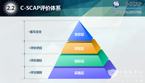 客车安全评价管理中心按照科学性、代表性、可行性、发展性的原则,通过对大量客车安全事故的案例分析,提炼客车本质安全要素,采用层次分析法,从制动安全、稳定安全、结构安全、保护安全四个维度,选取最能代表客车安全性能的关键项目构建评价体系,另外还从引领实用性新技术、新装备应用的角度在评价体系里设置了加分类项目。