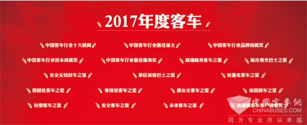 年度客车奖项包括:2017年度“中国客车行业十大新闻”、2017年度“中国客车行业最佳雇主”、 2017年度“中国客车行业品牌成就奖”、 2017年度“中国客车行业资本成就奖”、 2017年度“中国客车行业最佳服务奖”、2017年度“高端商务客车之星”、 2017年度“高端旅游客车之星”、2017年度“城市观光巴士之星”、2017年度“安全无忧校车之星”、2017年度“景区旅游巴士之星”、2017年度“轻量化客车之星”、2017年度“智能化客车之星”、2017年度“零排放客车之星”、2017年度“微公交客车之星”、2017年度“旅居房车之星”、2017年度“轻型客车之星”、2017年度“安全客车之星”、2017年度“未来客车之星”、 2017年度“新能源客车客户满意奖”等。