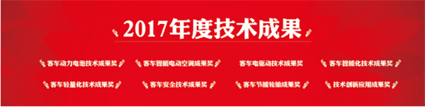 技术成果奖包括:2017年度“客车动力电池技术成果奖”、2017年度“客车智能电动空调成果奖”、 2017年度“客车电驱动技术成果奖”、2017年度“客车智能化技术成果奖”、2017年度“客车轻量化技术成果奖”、2017年度“客车安全技术成果奖”、2017年度“客车节能减排技术成果奖”、 2017年度“国际营销协助奖”、2017年度“技术创新应用成果奖”等。