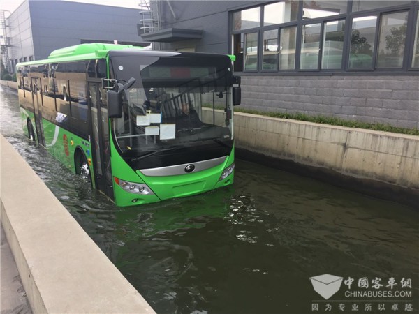 据国家电控中心副主任李飞强介绍,在防水性能上,宇通新能源客车要求B级电压部件防护等级满足IP68要求;整车涉水深度达到33cm,总绝缘电阻值超过2MΩ。此外,车辆还要通过浸水试验,即车辆在退电状态,在水深50cm水池浸泡24h,之后打开总火开关,并将点火开关开至ON档,2h后总绝缘电阻大于1MΩ,不起火不爆炸。
