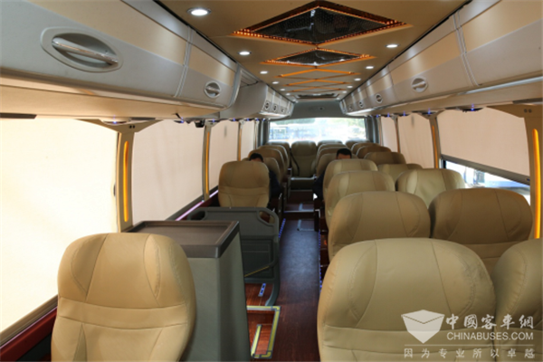 如何打造真正的高端旅游出行体验,无论重庆公运、渝快行,还是海格客车,双方都在努力探索。重庆公运与海格客车合作十余年,对海格品牌、品质以及研发能力甚为信赖。此次为了打造一款符合大众口味的高端客车产品,重庆公运设备技术部及下属的第三、九分公司与海格客车专用车中心结合市场调研、大数据分析,客户体验,最终共同设计研发出KLQ6122BAE53。沿着KLQ6122的木质踏板拾级而上,柔和的黄白色光线将车内的景致尽显眼前。“2+1”VIP布局座位,提供远远大于普通客车的有效乘坐空间;豪华座椅靠背曲线设计,乘坐舒适;座椅后背提供液晶显示屏,8国语言的大片,让旅客乘车也能影音娱乐;精致的棕色木地板、不露钉地板压条设计,地板整洁美观;米色内饰车厢,搭配车顶及左右两侧独特彩条氛围灯设计,温馨典雅、艺术气息十足;高铁遮阳帘、航空式行李舱,堪比高铁商务座、航空头等舱;车内配备有卫生间,让旅途更便捷、更人性化、更舒心;超越交通部最高营运客车等级的大高三级旅游大巴再次被重新定义。