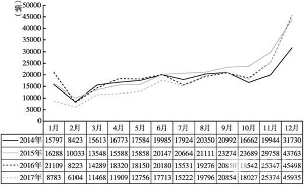 受政策调整的影响,2017年的客车市场演变之精彩程度,相比大起大落的2016年一点也不逊色。图1显示,2016年和2017年,我国5米以上客车市场遭遇了两连降。根据中国客车统计信息网数据,2016年,客车市场累计销售各类车型(大客、中客和轻客)25.16万辆,比上年同期小幅下滑1.91%;2017年,客车市场累计销售各类车型21.13万辆,同比再度下滑16.01%。比起2016年的小幅下滑,2017年客车行业的整体形势,显然要严峻得多。