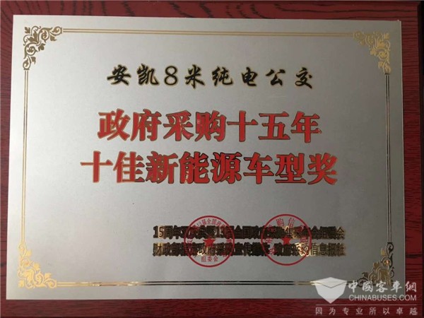 安凯8米纯电公交车荣获“政府采购15年十佳新能源车型奖”
