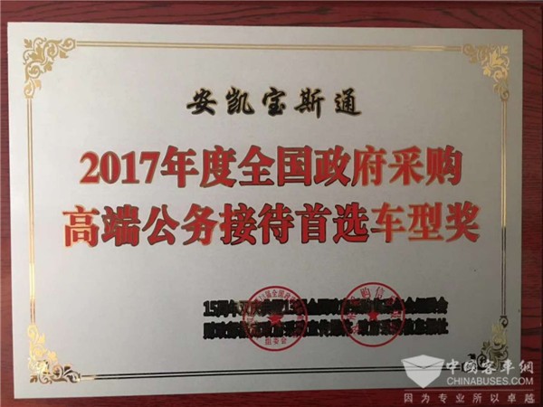 安凯宝斯通荣获“2017年度全国政府采购高端公务接待首选车型奖”