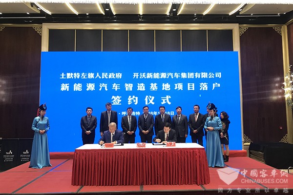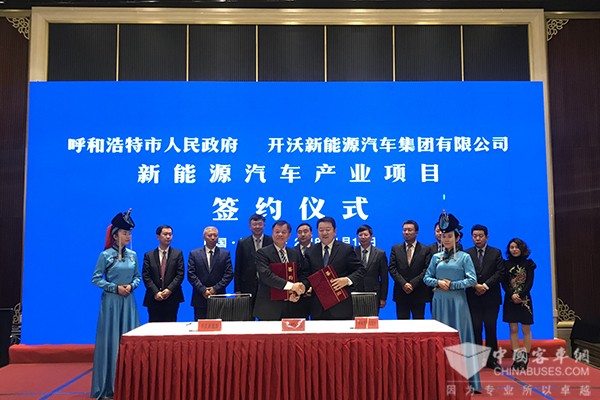 2018年1月18日,开沃新能源汽车集团有限公司与呼和浩特市人民政府签署新能源汽车产业项目战略合作,内蒙古自治区党委常委、呼和浩特市委书记云光中,呼和浩特市委副书记、市长冯玉臻,市委常委、秘书长吴志强、副市长毕国臣,市政府党组成员、经济技术开发区党工委书记李建平,土左旗委书记斯日古楞,开沃汽车集团董事长黄宏生,副总裁金晓辉以及呼市政协、财政局、经信委、规划局、国土局、发改委等相关部门领导出席本次签约仪式。