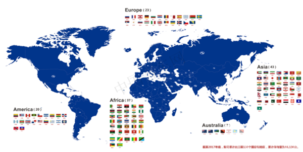 宇通客车已批量出口30多个国家和地区,覆盖全球五大洲的主要市场。仅在委内瑞拉,宇通2013年出口2000台客车,2015年再次与委内瑞拉2300套客车KD件(Knocked Down)销售合同。