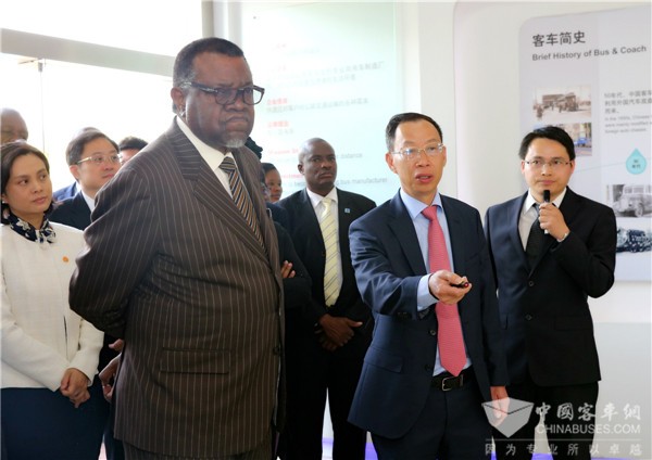 黄书平总经理向根哥布总统介绍海格客车海格客车总经理黄书平向根哥布总统介绍了公司发展历程、产品技术研发、新能源客车推广应用以及海外出口等情况。根哥布总统参观了海格展厅,并登车体验了海格即将出口到纳米比亚的9米旅游客车。