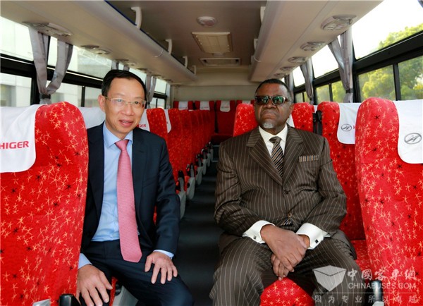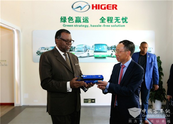 根哥布总统对海格客车规模化、专业化的客车制造水平赞叹有加。他表示,随着全球合作的不断加深,会有更多的中国企业去纳米比亚投资,实现互惠共赢,他期望海格客车为纳米比亚交通装备事业发展做出贡献。在体验海格出口到纳米比亚的旅游客车时,他饶有兴趣地了解了该车的性能特点,并表示这款车非常豪华,乘坐也非常舒适,对促进纳米比亚的旅游客运事业会有很大的帮助。黄书平向根哥布总统赠送了象征美好祝愿的海格车模,并表示期待与纳米比亚深入合作,让更多的海格客车更好地服务于纳米比亚人民的交通出行,促进纳米比亚交通运输事业的发展。