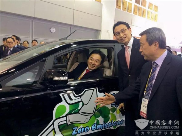 济州岛知事元喜龙、韩国国际电动汽车博览会组委会委员长金大焕、比亚迪亚太汽车销售事业部总经理刘学亮在博览会上亲密交谈