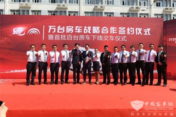 当日,在一片热烈的掌声中,香港摩天集团董事局副主席鲁国征与宇通客车凯伦宾威房车公司销售总经理马蓬勃进行了首批百台房车下线交车仪式。