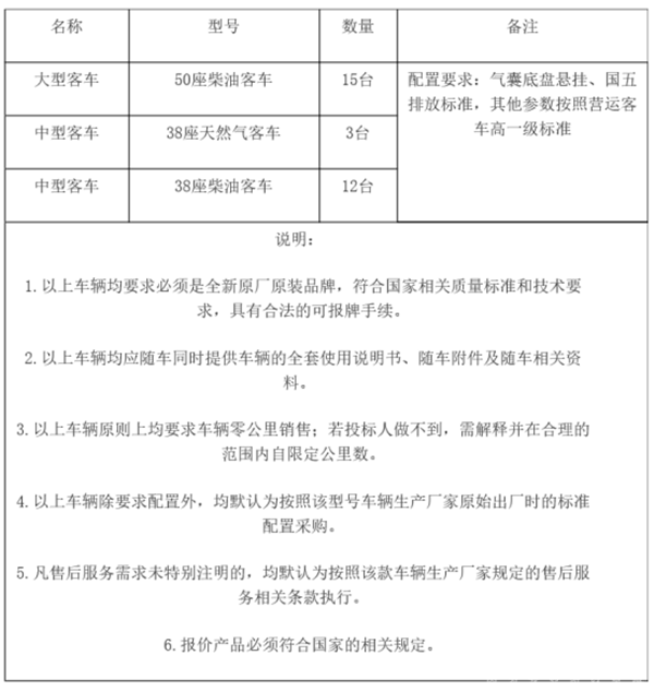 2.7 交货期要求:车辆分批次交付,中标供应商在合同签订之日起二十个工作日内交付第一批三台38座天然气客车中型客车,中标供应商需接受招标人派遣人员到现场随时了解车辆制造进度。其余车辆按线路运输资质办理进度协商交付。