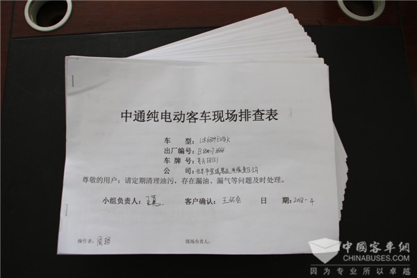 同时,中通客车制定了《中通纯电动客车排查作业指导书》和《中通纯电动客车现场排查表》两个指导操作文件,事无巨细,小到搭铁线螺丝的紧固、保险丝的检查,大到电机总成系统的检测,每一项都有着详细的标注。每一项检查后都必须有负责人签字,责任分配细致可靠。同时,最后要有用户方面负责人签字确认。