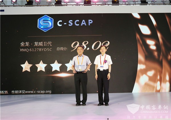 中国客车安全评价管理中心严格按照受理、计划、测试和审核流程,独立、客观、公正地对多家企业的多个主力车型开展了第一轮测评工作。截至2018年5月,最终有3个整体表现优异、安全技术水平较高的车型获得五星级评价。金龙客车龙威Ⅱ代XMQ6127BYD5C凭借强大的实力,以98.02的最高分,获“中国超五星级安全客车”称号。