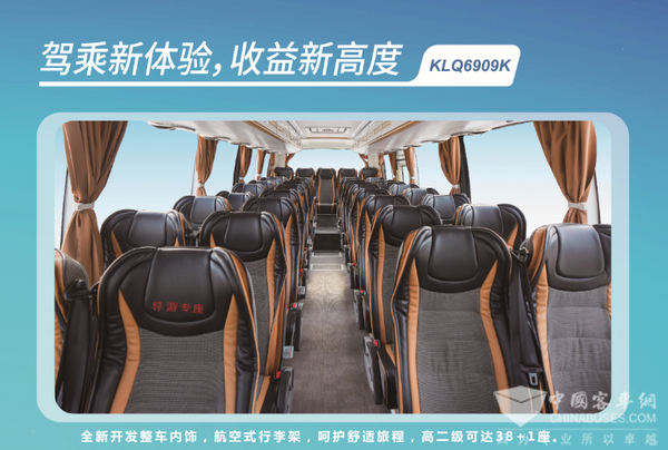 整个内饰的主色调采用了黑白金三种,整体调性相当统一,给人以高大上的感觉,而且乘客乘坐时的舒适性也是相当优秀。其内饰采用了飞机机舱的设计,左右两侧的行李架采用“双色共挤”工艺,一种材质呈现两种质感,且全部安装了旋转式舱门,防止行李在行驶过程中掉落。