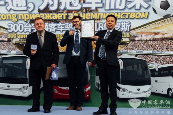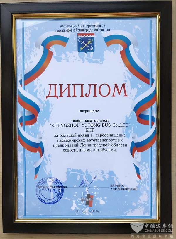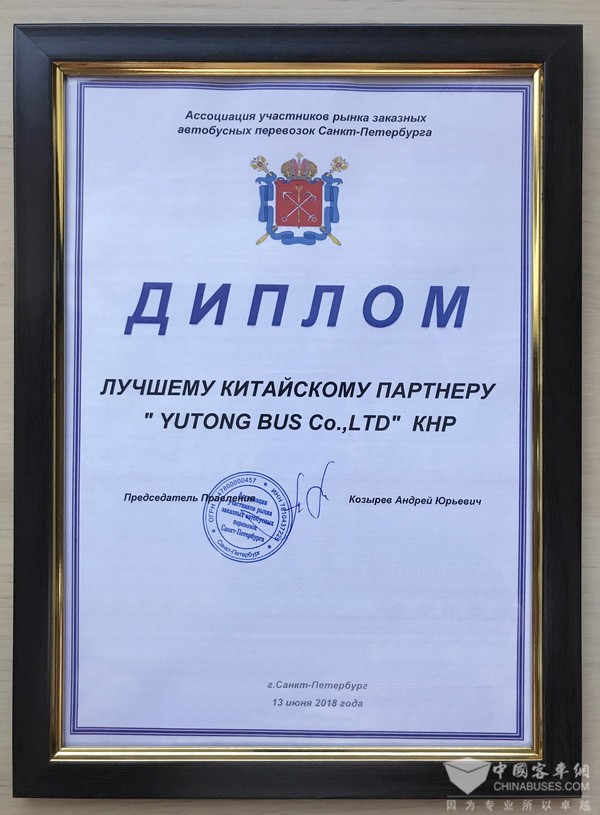 圣彼得堡运输协会授予宇通“最佳中国伙伴”荣誉,列宁格勒州运输协会授予宇通“最佳旅游巴士供应商”荣誉,并期待双方在交通运输领域有更深入的合作