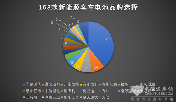 从电池品牌看,新能源客车整车企业在电池选装上有了更多选择,有28家电池配套企业为本批客车提供电池。宁德时代、微宏、北京国能、合肥国轩等占据着动力电池领域的市场优势。