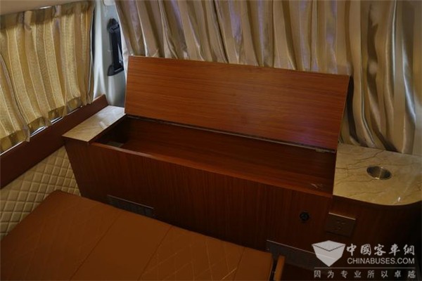 前面的隔断,并不是单纯的要把驾驶室与生活舱隔开,而是除了桌子的功能外,还有柜子的功能,除了储物外,其实还可以放下一个上开门的车用冰箱。