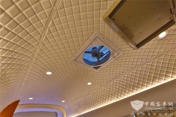 在这个前隔断的上方,除了出风口,就是一个19寸的吸顶电视,我们可以看出他的电视内容正是来自顶部的卫星接收器。