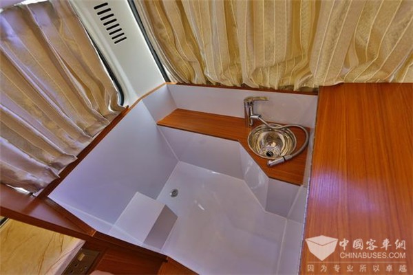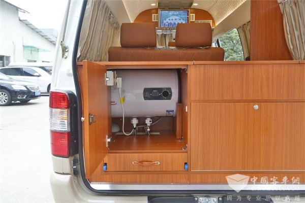 从车内来看尾部的另一边,就是一个半开放式的洗手间,设计的很巧妙的是,它平时是被一块木板盖住,上面就是一张床,铺上垫子可以睡一个孩子;打开这个盖板,竖起来,就成了洗手间的一面墙,如果再加一圈浴帘就更好了,窗帘啥的不会打湿了。为 了省成本,没有安装马桶,可以使用移动房车马桶,价格也不贵,很多房车用户觉得完全没有必要,在加油站什么的都能解决了,最好不在车内上厕所。他的清水箱是80L,污水箱是35L。
