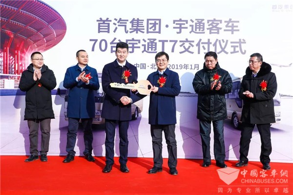 宇通客车营销副总监王文韬(左四)向首汽集团总经理高捷(左三)递交 “金钥匙”