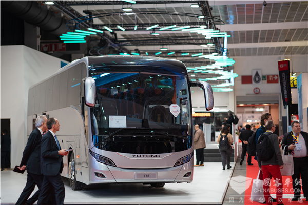 而宇通T13,则是2018年宇通根据欧洲市场研发的高端旅游车。该车在2018年英国伯明翰车展一经亮相,即获得英国市场的认可。车辆外观邀请欧洲知名造型公司全面参与设计,整车线条流动修长,边角柔和有度;豪华座椅、USB接口、整车新风换气系统给乘客带来更加舒适的乘坐体验。