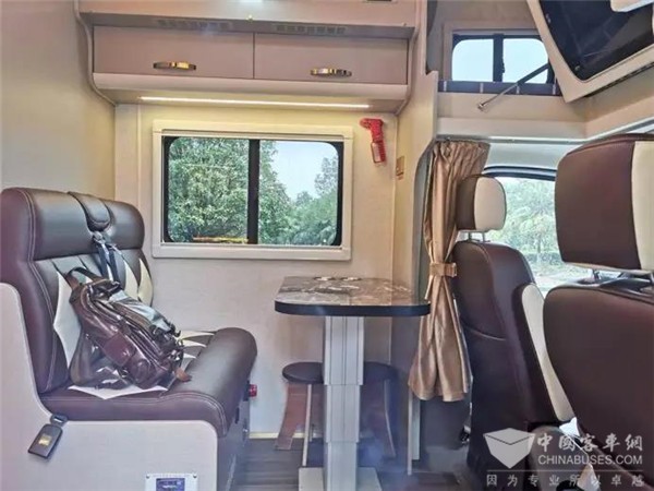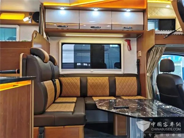 休闲会客区采用L型卡座沙发设计,搭配一张可升降的小桌,临时可拼成一张床,沙发内侧墙壁上有外推窗,推窗上方有储物柜,方便日常使用,车顶有氛围灯。
