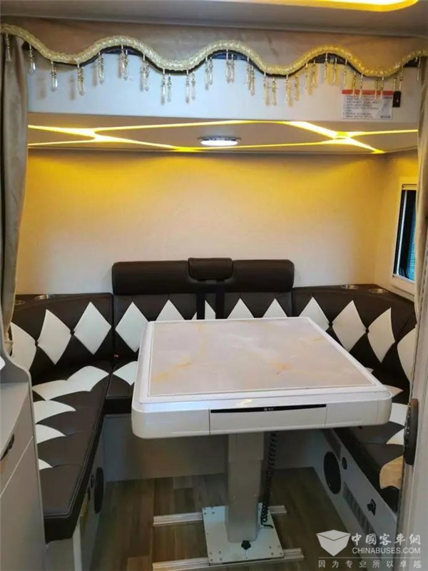本车可以选装娱乐系统:KTV系统、全自动麻将机等,后环形沙发布局车型麻将机自动升降可以变双人铺,上方配备升降双人吊床。