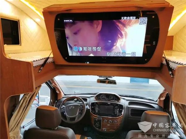 C型房车额头设计为双人床,宽度2米以上完全可以满足两名成年人休息,32寸车载网络电视采用翻转设计,行车过程中放平,驻车时可以翻转后观看电视节目或通讯K歌系统。