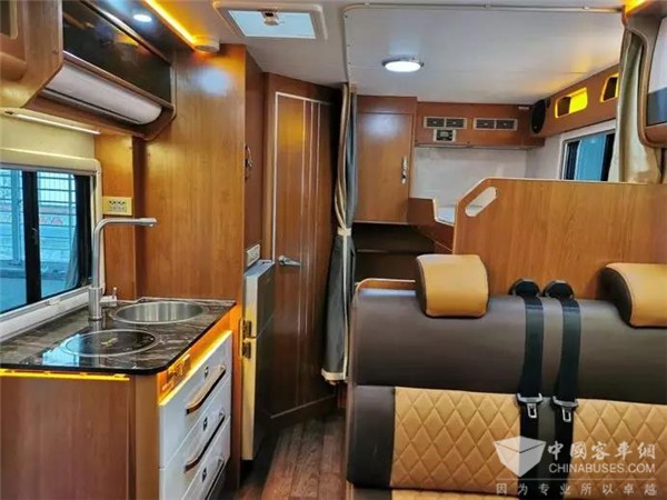 车厢中部设计安装厨具设备,配备304不锈钢水槽、电磁炉、101L双开门车载冰箱等,可选装微波炉。