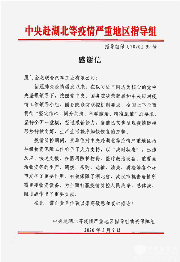 此前,金龙客车收到中央赴湖北等疫情严重地区指导组物资保障组发来的感谢信。信中对金龙客车在疫情防控期间有效保障湖北省、武汉市所需重要物资设备作出的重要贡献表示感谢。