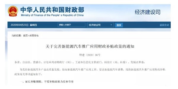2020年4月23日,财政部、工信部等四部委联合发布《关于完善新能源汽车推广应用财政补贴的通知》(财建(2020)86号文),《通知》提出,将新能源客车推广应用财政补贴政策实施期限延长至2022年底。平缓补贴退坡力度和节奏,并且明确2020年新能源客车补贴不退坡。