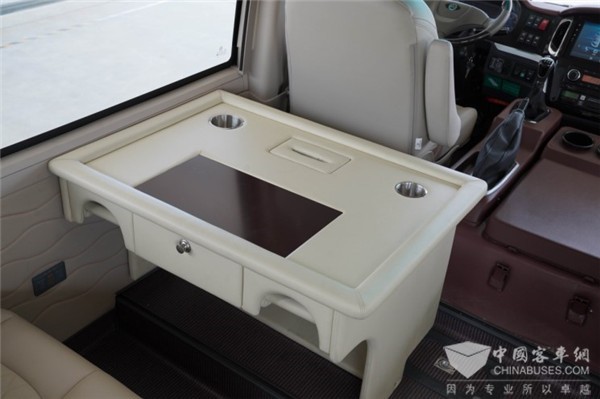 既然是面向公商务市场,办公区域设计必不可少,位于主驾座椅后面的办公桌采用皮革包裹,四周都设计了包角。为了方便电脑等办公部件的放置使用,中间采用了一块光滑的平面材料,桌面采用内凹设计,防止车辆行驶过程中物品从桌上滑落。