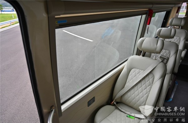 车厢内部采用了1+2的座椅布局,内设14个座椅,每张座椅都带有旋转扶手,可调节的头枕以及独立安全带。座椅采用了皮革材质,也使得内饰更加稳重。座椅侧面安装了双USB充电接口,充电速率为5V/2.4A。