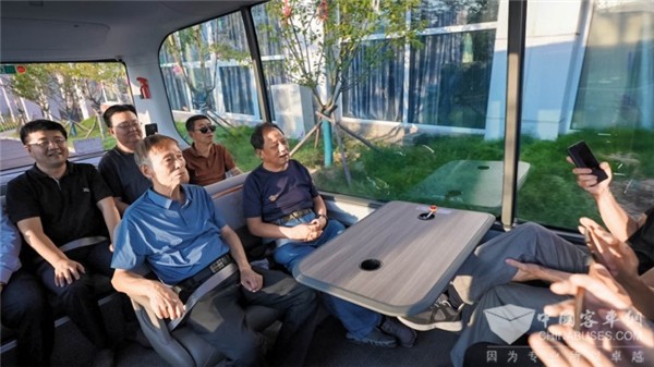 随后,市民代表们开始登车进行试乘体验。只见车厢中央一张车载桌将座椅平均分开,车辆前方并无方向盘,而是在车顶处安装了两块显示屏,车内四周被大面积的车窗覆盖,视野效果极佳。