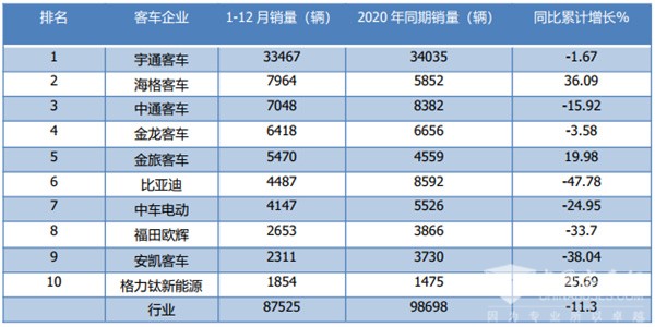 上表可见,在2021年1-12月7米以上客车累计销量中,Top10客车企业呈现以下特点: