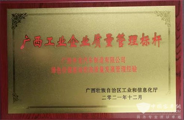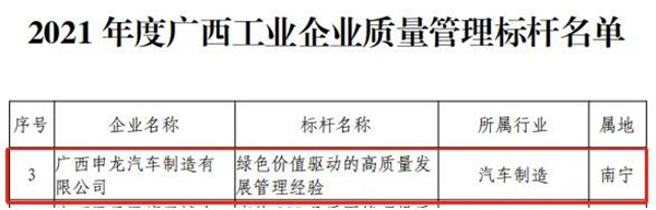 经过专家评审,广西申龙汽车制造有限公司实施“绿色价值驱动的高质量发展管理经验”等53项典型经验被确定为2021年度广西工业企业质量管理标杆。