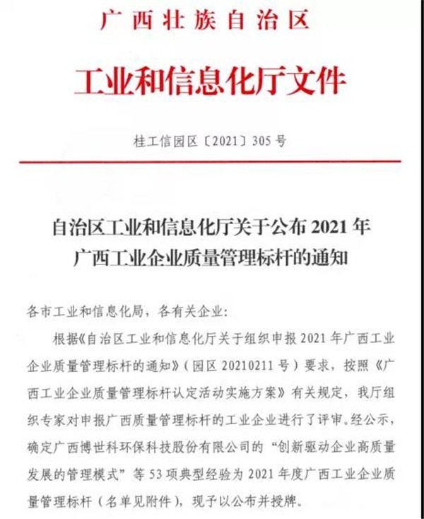质量标杆是指工业企业应用先进质量管理方法和质量工程技术、开展质量管理创新活动,以提高质量水平、提升经营绩效的最佳实践。2021年“广西工业企业质量管理标杆”遴选工作由广西壮族自治区工业和信息化厅组织,中国质量协会组织专家对提报材料进行评审,最终评选出具有科学性、创新性、系统性和示范性的“质量标杆”。