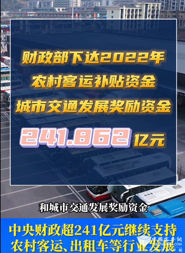 2022年4月18日,财政部发布消息称,将下达2022年农村客运补贴资金和城市交通发展奖励资金241.862亿元。其中农村客运补贴资金100.2906亿元。